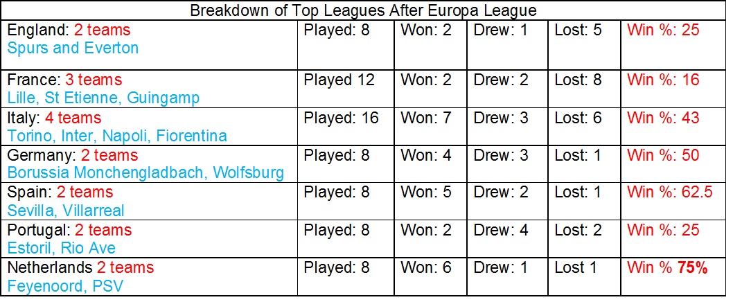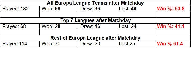 There has been four match days in the competition so far, below is the record of all the Europa League teams combined in their domestic fixtures following a Thursday game. The top 7 leagues that were taken were: Premier League, La Liga, Ligue 1, Serie A, Bundesliga, Primeira Liga and Eredivisie.