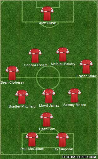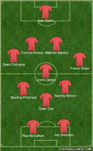 The former West Ham coach continued as much of pre-season with a 4-4-2 diamond, offering starts to 5 summer signings. Sean Clohessy and Fraser Shaw started at full back with Connor Essam partnering new captain Mathieu Baudry at center half. Sammy Moore started alongside Bradley Pritchard as the “2″ in the diamond while Paul McCallum started in attack.